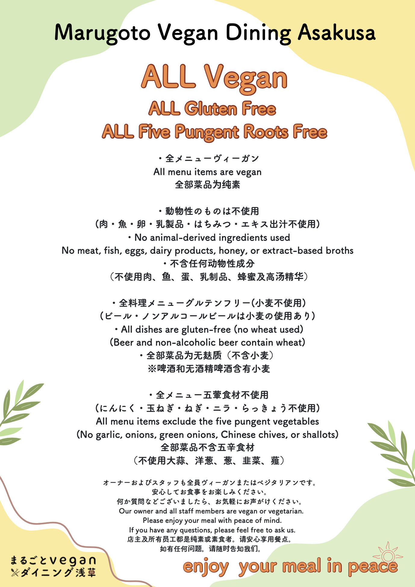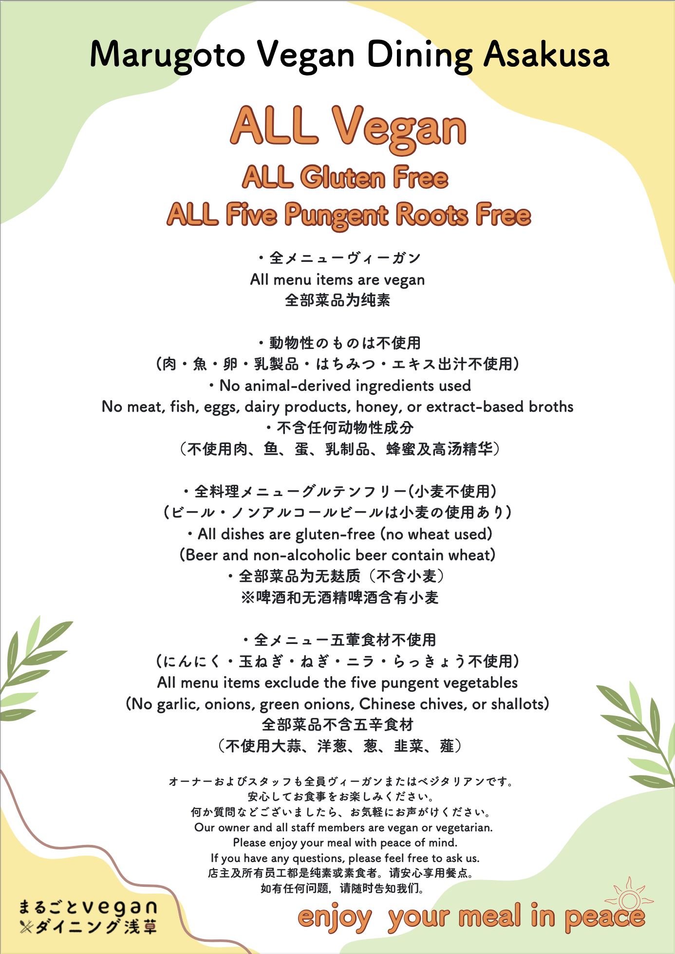 ・全メニュー五葷不使用 All menu items exclude the five pungent vegetables